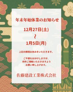 👷♂️冬季休業12月27日〜1月5日まで、お休みをいただきます。